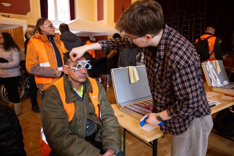 A rászorulók idén is részt vehettek látásvizsgálaton, melyet Raák Benedek szervezett, a vizsgáló optometristák pedig Tóta Csaba, valamint Dorogi Dézi és Molnár Réka optometrista hallgatók voltak mellettem. A szemüvegekhez a kereteket és a lencséket ismételten a Noptiker Kft. nagylelkű felajánlása biztosította. A látásvizsgálat során ismét szembesültünk azzal a valósággal, amelyről a mindennapi szakmai életünkben könnyű megfeledkezni: a hajléktalan emberek jelentős része több, egymással összefüggő egészségügyi problémával küzd – cukorbetegséggel, magas vérnyomással, kezeletlen szemészeti betegségekkel, korábbi sérülésekkel –, miközben esélyük sincs rendszeres vizsgálatokra, a tisztálkodási lehetőségek hiánya, a szenvedélybetegségek, illetve a nem megfelelő szemüvegek használata pedig mind súlyosbítják a helyzetet.